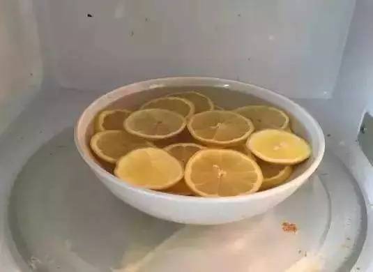 檸檬切片,放入可微波的碗中,加入4~5 湯匙醋,加滿(mǎn)水。將碗放入微波爐內(nèi), 開(kāi)高火微波5-10分鐘。將碗拿出來(lái)后, 用干凈的濕抹布就能輕松擦掉微波爐內(nèi)的油漬啦!