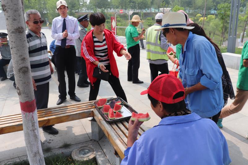 在公園的小廣場(chǎng),慰問小組工作人員為員工切好西瓜,把西瓜、面包、白糖依次遞到員工手中,員工們親切的笑聲與慰問人員的互動(dòng)形成了親情、溫情的交織,一片生動(dòng)和諧的場(chǎng)面。雖然是一個(gè)個(gè)面包,一塊塊西瓜、一袋袋白糖,卻使員工永遠(yuǎn)記住了這美好時(shí)光。崔主席也親自為員工切起了西瓜,員工們品嘗著西瓜和面包,感受著領(lǐng)導(dǎo)的關(guān)懷,決心做好自己的本職工作,為晉城創(chuàng)建全國(guó)文明城市做出積極貢獻(xiàn)。