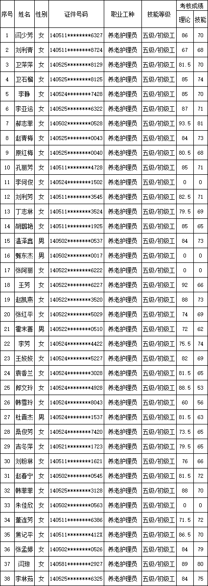 山西潔霸清潔服務(wù)集團股份有限公司職業(yè)技能等級認定中心2025年11月9日第2批養(yǎng)老護理員初級認定人員成績公示
